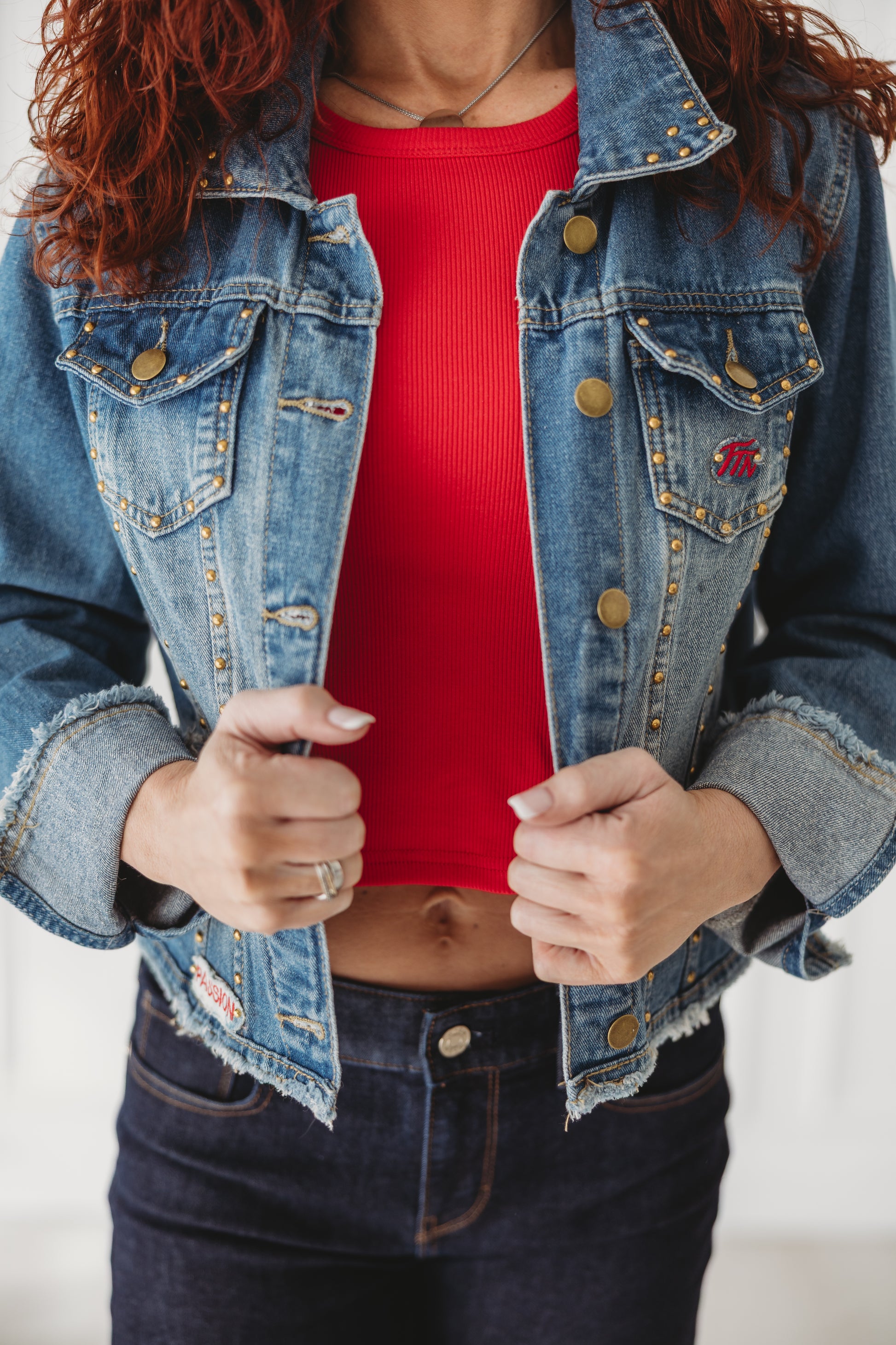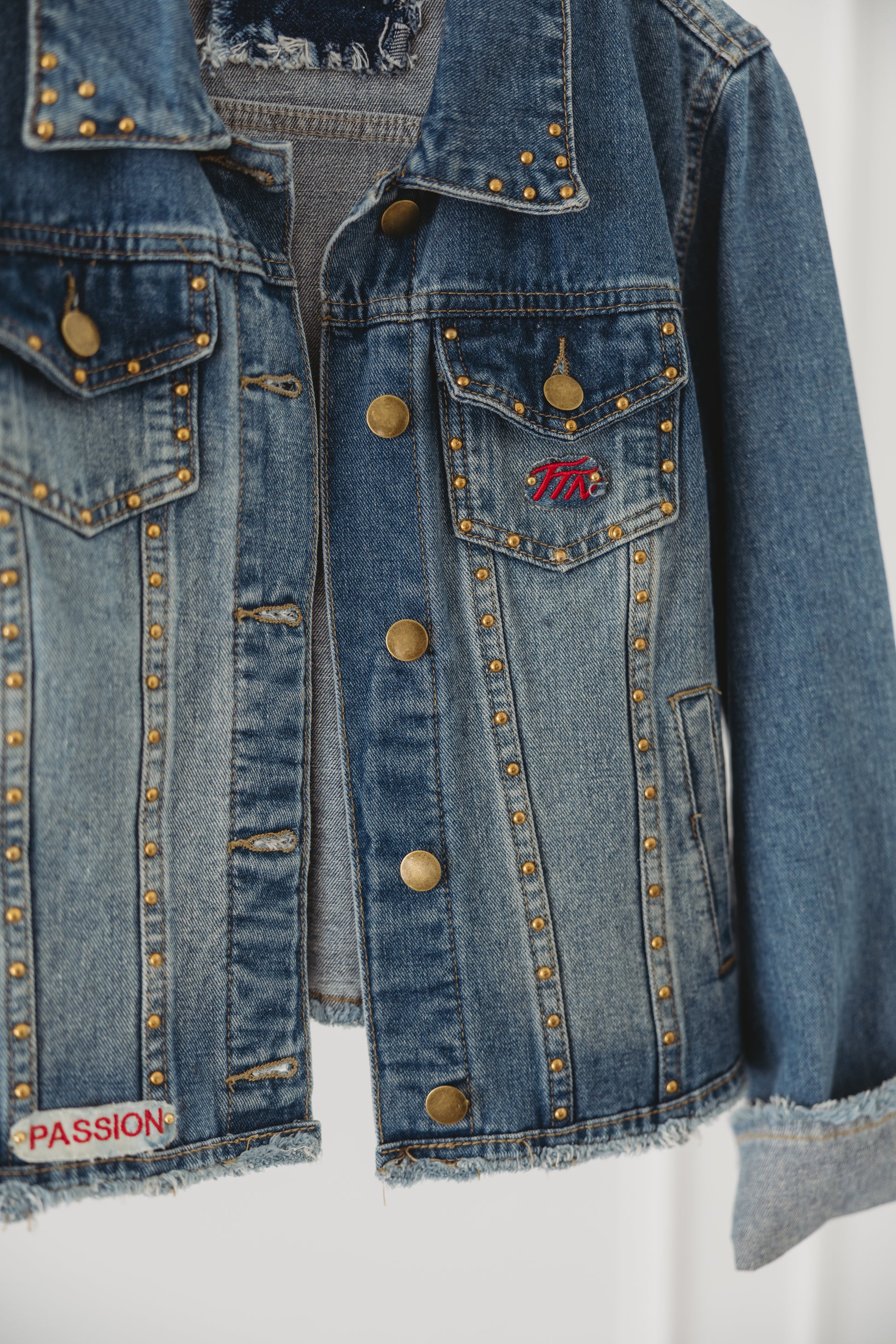 Crafted in a medium-wash premium denim with structured shaping and a modern cropped cut, this jacket balances classic Americana with fearless feminine energy. Gold stud accents trace the seams, pockets, and collar, adding edge without overpowering the silhouette.
