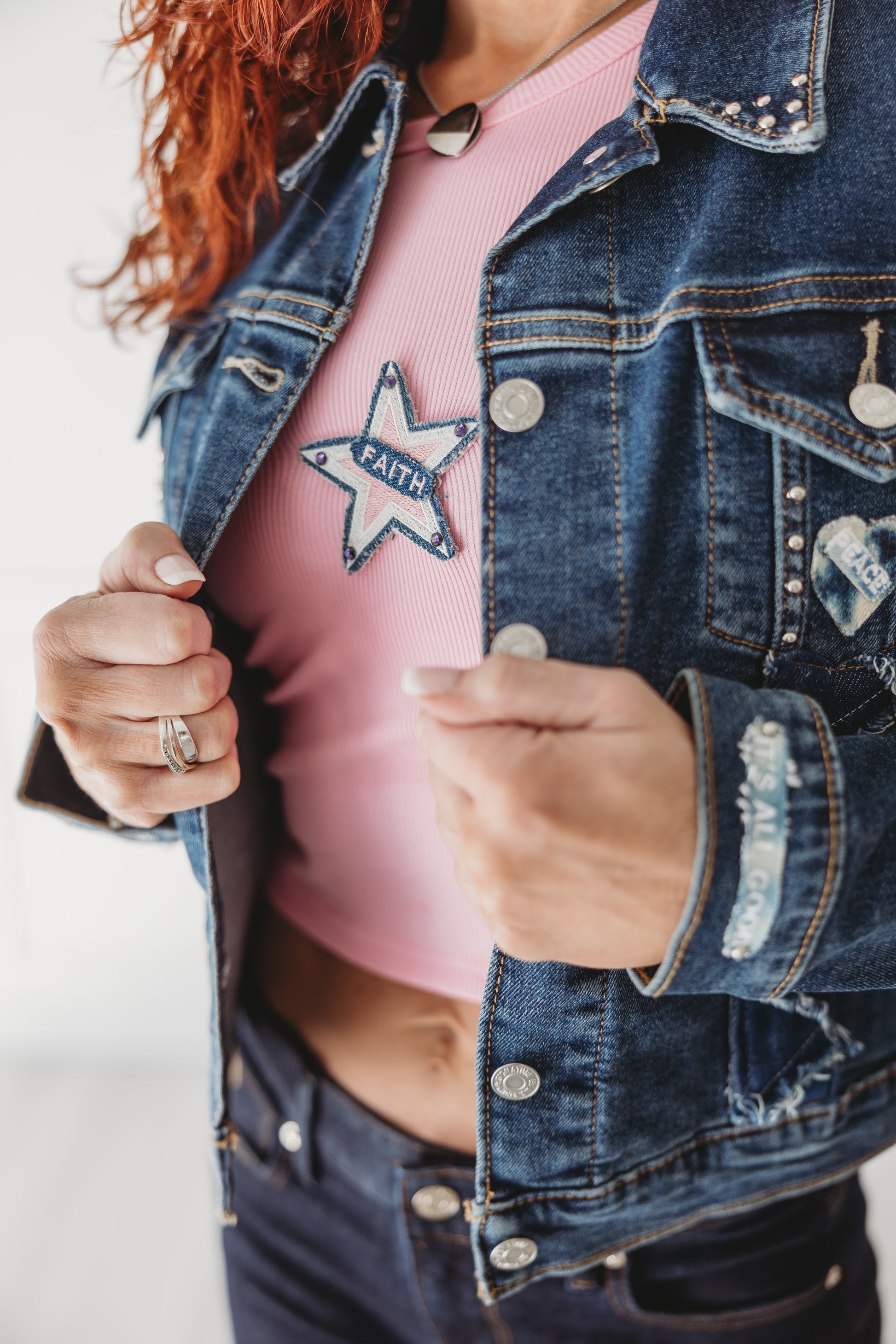 The structured silhouette delivers a flattering, tailored fit, while stud detailing along the collar and chest adds just enough edge. Front heart patches and star embellishments bring personality and purpose together in one wearable statement.